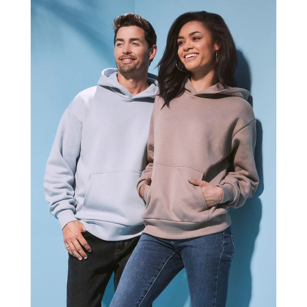 Details dropped shoulder; relaxed, modern shape; unisex style – great for both men and women; Tear-away Size and Care Label in Neckline; high-quality ring-spun combed cotton; double fabric hood without drawcord; kangaroo pocket; available in 10 colours; wide rib