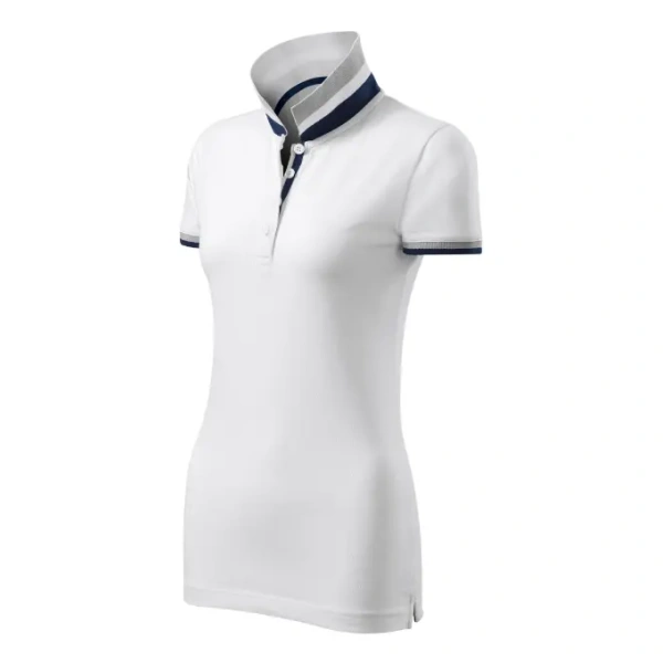 slight fit cut with side seams 1:1 rib knit collar with a contrast stripe narrow placket with 5 buttons in the shell fabric colour slits in side seams with a contrast tape inner neckline with a contrast tape fixing shoulder seams cotton treated by mercerization